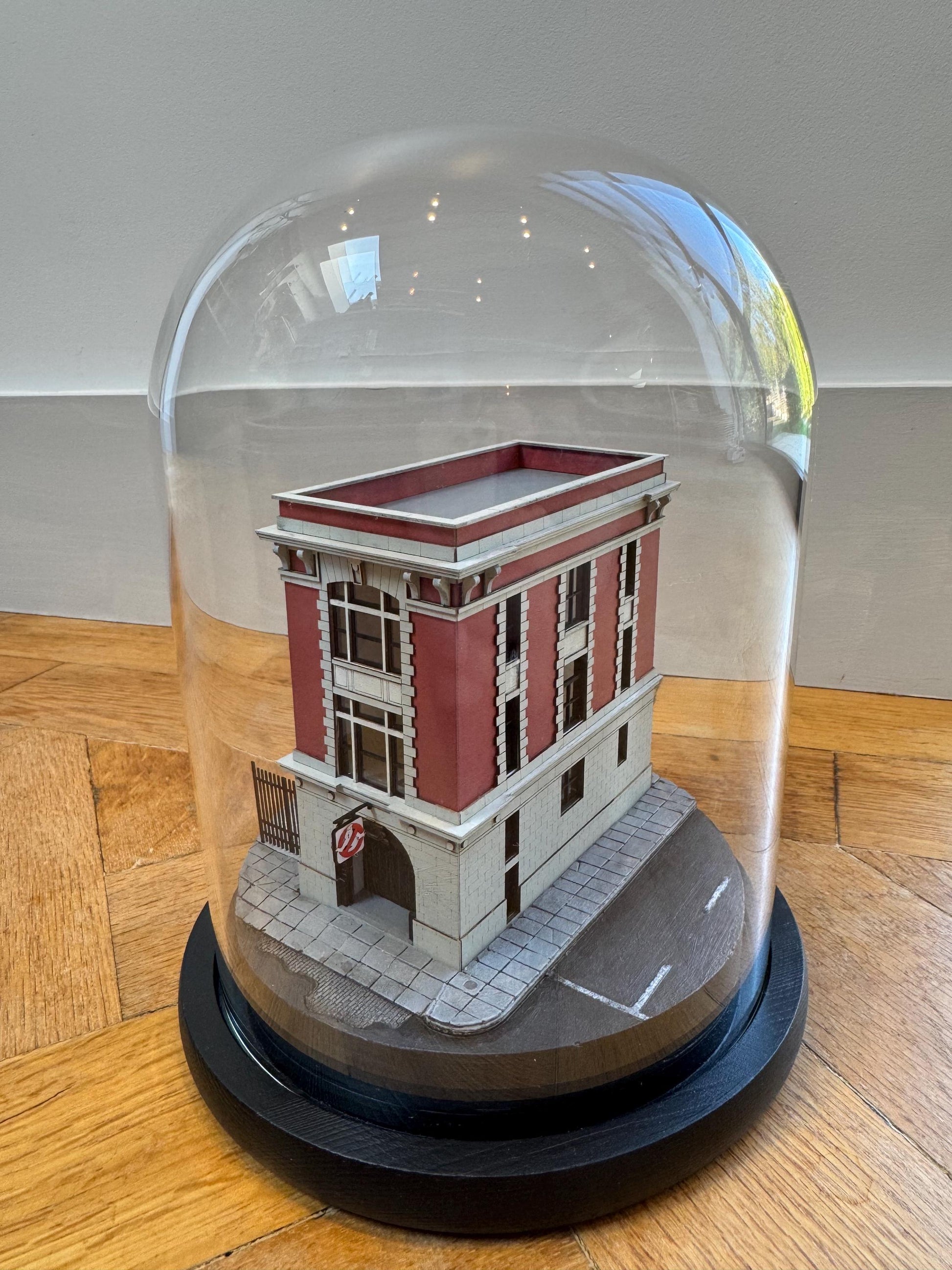Handmade miniature model inspired by the firehouse featured in Ghostbusters. This is handmade by me in my home studio, constructed from card, paper clay and other modelling materials. This comes complete in the glass dome. The glass dome is 20cm high x 15cm wide (8 inches high by 6 inches wide). The base is 17cm wide (6.7 inches).